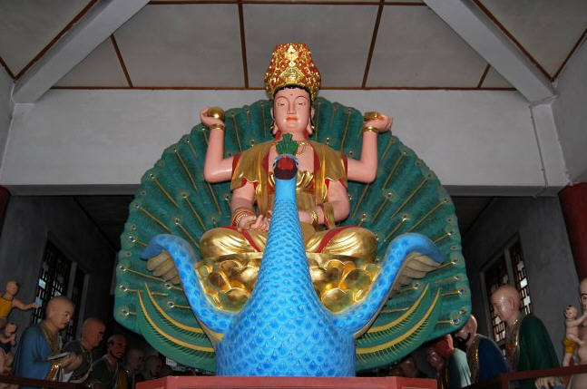 入口处,是孔雀明王,明王呈一面四臂之相,手持莲花、俱缘果、吉祥果、孔雀尾,跨乘金色孔雀王。所持四物中,莲花表敬爱,俱缘果表调伏,吉祥果表增益,孔雀尾表息灾。此明王为毗卢遮那如来(释迦牟尼佛的法身佛)之等流身(也算一种化身)。左以迦叶领头,右以阿难领衔。