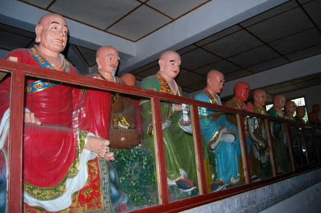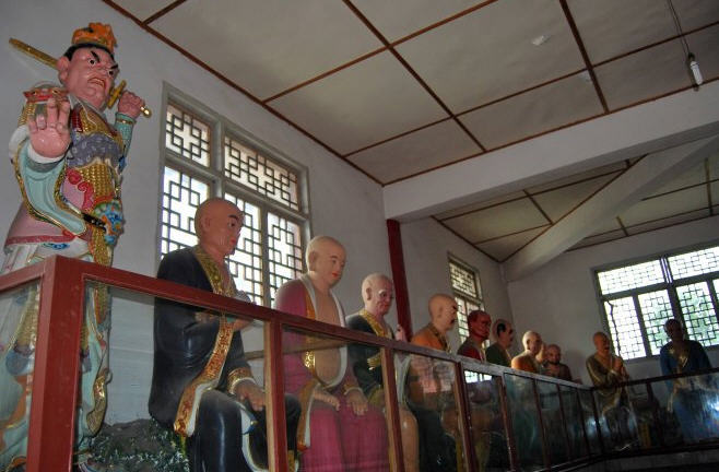在罗汉堂的一处过道中,还有济公和尚,据说济公不属于五百罗汉,所以只能站在过道上,从不排列在罗汉的队伍中。