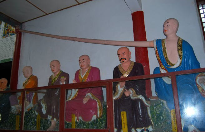 这位手伸的很长的罗汉叫须弥望尊者。须弥望,即望须弥,须弥是著名的神山,佛教传说,须弥山是人类所住世界的中心。据说,须弥望尊者乃是虔诚的佛家弟子,他努力修行,心想须弥,眼望须弥,最后得以证阿罗汉果,因名须弥望。