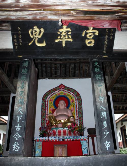 兜率宫内,塑竖三世佛的未来佛——弥勒佛,笑容可掬。弥勒本是如来的弟子,为弥勒菩萨,居住在六欲天中的兜率天宫,在那里讲经说法。因“彼多修慈心,多入慈定,故名慈氏。修慈最多,名无能胜”。由于现生(现世)佛——释迦牟尼佛预言他在兜率天寿命终尽时将下生人间,继之为佛,因此他又被称为一生补处菩萨,即下一辈子即可替补成佛的菩萨。由于他将来必定成佛,因此也被称为弥勒佛,又称未来佛。