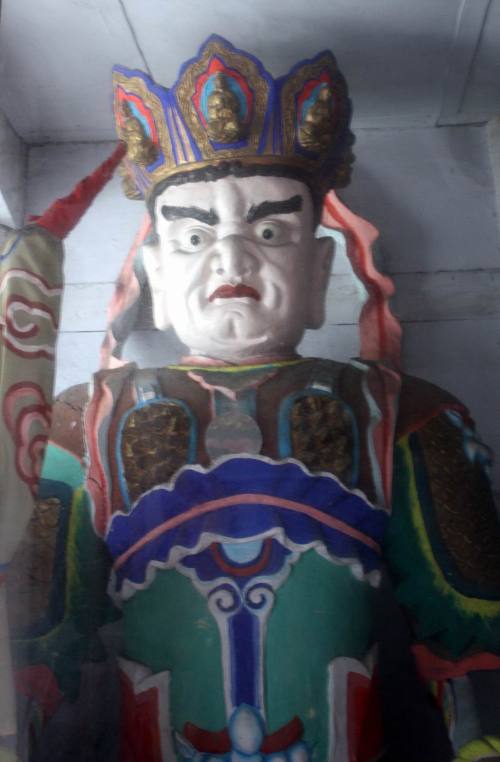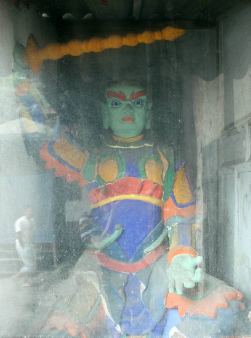 弥勒佛两旁,立四大金刚,背面站立金甲韦陀执金刚杵,遥对正殿的释迦牟尼佛。