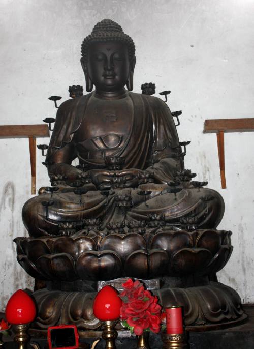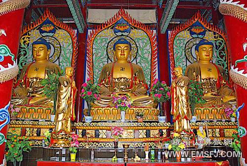 正殿内塑有“三身佛”。“三身”,即法身、报身、应身三种佛身,又叫自性身、受用身、变化身。“身” 除指体貌外,亦有“聚积”之义,即由觉悟和聚积功德而成就佛体。佛教以这三身来象征和体现佛身上具有的理法、智法和功德法。“三身佛”即法身佛、报身佛、应身佛。法身佛又称毗卢遮那佛(或毗卢舍那佛、大日如来),代表佛教真理(佛法)凝聚所成的佛身。“毗卢遮那”的意思是“遍一切处”,就是他的光明普照万方。报身佛又称卢舍那佛,是指经过修习得到佛果,享有佛国(净土)之身。“卢舍那”的意思就是智慧广大,光明普照。应身佛又称化身佛,即释迦牟尼佛,指佛为超度众生、随缘应机而呈现的各种化身。因为释迦牟尼能以大悲大智爱护众生,给予欢乐,使众生脱离生死苦海。有的寺庙的大雄宝殿塑“三身佛”,其中中间是法身佛毗卢遮那佛,左边为报身佛卢舍那佛,右边是应身佛释迦牟尼佛。下图是网络图片——三身佛,由于这里不准拍照,只好找一张相同的图片说明“三身佛”。