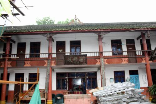 燃灯古佛是“竖三世佛”中的过去佛,“生时,一切身边如灯,故名燃灯太子,作佛亦名然灯”,又叫定光佛、灯光佛、普光如来。据说燃灯成佛后,游行世界,开化群生。是时有梵志儒童,值灯光佛游化,乃散花供佛,并解髻布发于泥道上,请佛蹈之,佛乃为儒童授来世成佛之记,并说:“善男子,汝于来世,当得作佛,号释迦牟尼”。此儒童即释迦牟尼佛,而此后九十一劫时,儒童果然为佛,佛教经文中称其为现世佛,与过去世佛燃灯古佛和未来世佛弥勒佛统尊为竖三世佛。下图是药师殿。