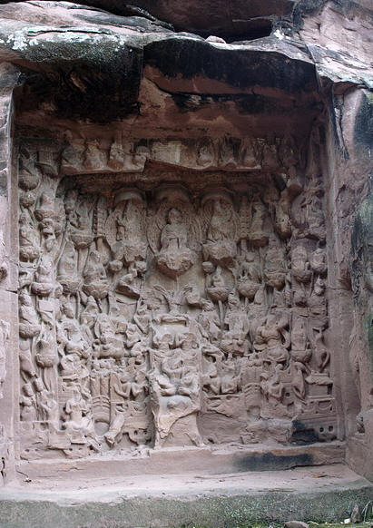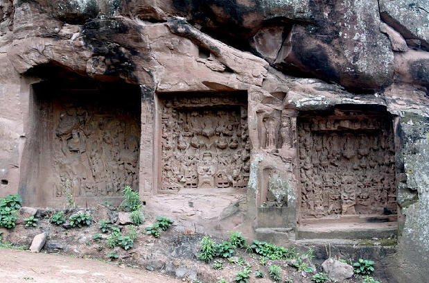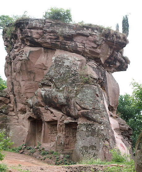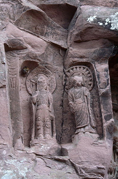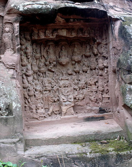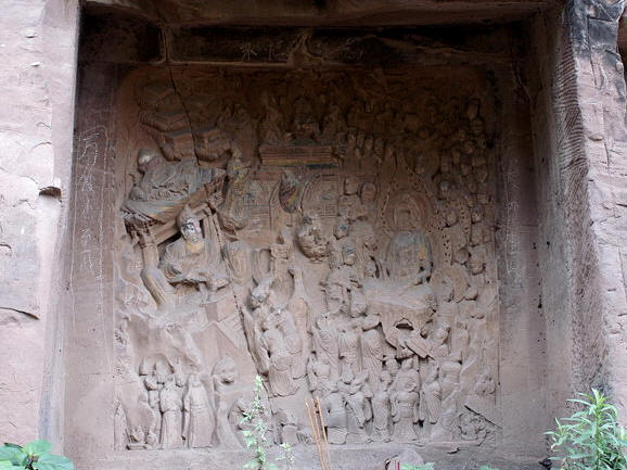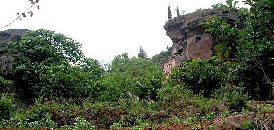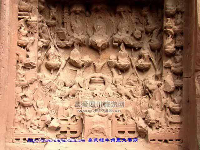 牛角寨的摩崖造像群,融儒、佛、道三教合一,乃宗教胜地,香火旺盛。有碑刻云:“大唐天宝八载(749)……三洞道士杨行进,三洞女道士杨正真……共造三宝像一龛。”相传,在牛角寨附近文宫场生长的当代名人董长安、潘文华、石鲁和冯建吾弟兄等,都曾到此拜佛。潘文华曾两次拿钱装饰庙宇、点缀佛像。