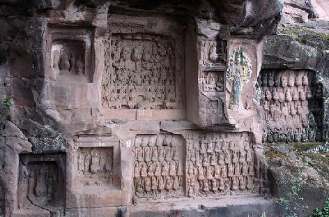 大佛周围还有摩崖造像2480尊,已编号建档101龛,1519尊。人物众多,相貌各异,或立或卧,或静或动。有的曲腿躬腰,俯首侧耳作恭听状;有的五体投地作跪拜状;有的系裙穿甲;有的曲臂挽带;舞伎翩翩起舞,乐伎吹打弹奏。造像除人物外还有器皿禽兽。千姿百态,栩栩如生。雕刻精致,刀法圆润,线条流畅,造艺精湛,具有很高的历史、艺术和科学价值,是我国石刻艺术的宝库之一。