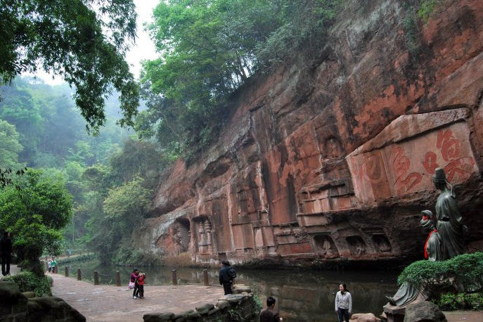 从接引亭起,在三华里长的道路左方的危岩绝壁上,密布着许多唐宋两代的摩岩造像。《蜀中名胜记》云:“馋岩为百千万亿佛,如恒河沙数。”即指这一带摩岩造像之多。一九八二年六月,四川省文物普查工作组临场鉴定,中岩全山除幸存的石刻一百零九局外,尚有佛龛四十八座,大小佛像二千四百九十二尊。这些佛像集中分布在牛头洞、罗汉岩、卧佛窟、仙人床、玉泉岩等处。