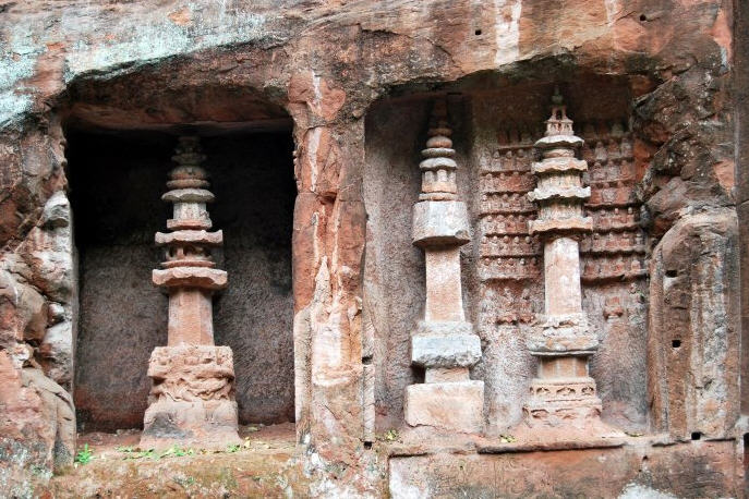 唤鱼池左壁,凿有经幢三座,造于唐咸通元年(860年)。三座经幢的四周,刻有佛号“佛顶尊胜陀罗尼幢”和佛经。居中一座经幢的正面,刻有“咸通元年(公元860)九月二十二日何偕无兄弟拾中岩院基界至此。黑水孔为界题”,这局石刻是唐懿宗李漼(cuǐ)年间的遗产,至今已有一千一百多年的历史了。