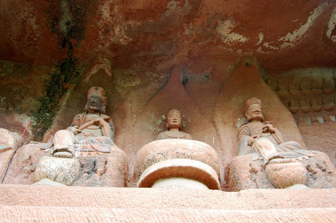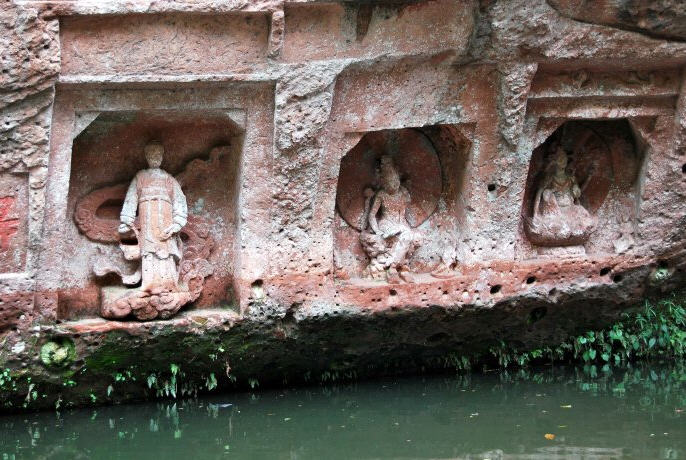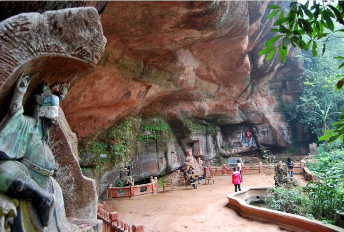 千佛长廊左侧危岩绝壁间,窟内有一石,如床,床面凹形似仙人曾卧,故名仙人床。相传唐代高僧无尽禅师常居此岩入定参禅,后成正果坐化。《蜀中名胜记》卷十二载:“悬崖峭壁,上刻千佛,岩覆如屋,上有仙卧之迹。”仙人床岩壁造像计有3龛,可惜不易登临亲见。