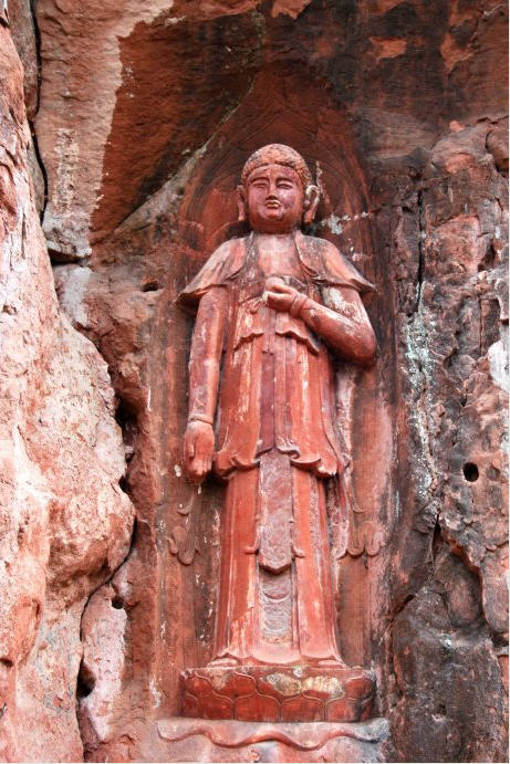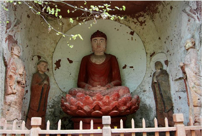 再往前,可见路旁有一座小亭——接引亭,这里是千佛长廊入口处。接引亭正面峭壁间,是接引佛的造像。他左手微卷胸前,持有佛珠一颗,右手垂直,掌心示众。佛家语:“引接化度”化教众生而济度也。“接引佛“的造型,即含“引接化度”之真谛。