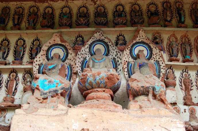 这是第四龛三大佛及八十二小佛造像。龛高350厘米,宽800厘米,深150厘米,三大佛跏趺式莲座居中,八十二小佛分列上下左右,上一台分左右共26尊,二台22尊,第三、第四台各17尊。除第一台左角处一立式小佛完好外,其余均遍体鳞伤。