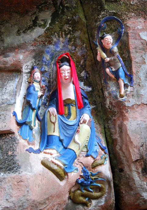 石壁右下方,还有观士音菩萨像3龛,其中的着农妇装提篮观音摩岩造像,世所少见。