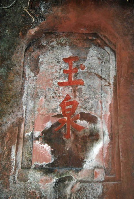 这是黄庭坚题刻的“玉泉”。“玉泉”二字约斗大,笔力遒劲,左下刻“山谷老人书”5字。黄山谷当年就在此处与诗友“流杯吟诗”。明代兵部尚书郭子章《三岩》诗云:松号石峡龙吟雨,茶煮玉泉鹤避烟。