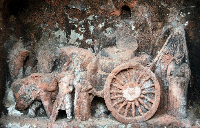 窟内有不少摩岩造像与雕塑,其中,“巡城图”(牛车人物浮雕),造型为一辆大轱辘车载一佛持杖全跏趺式于莲座上,一夫执鞭驱牛行驶,两旁有数人簇拥,形若祈祷,故又有“黎民求佛去灾图”之称。规格为100×96×32(厘米)。浮雕下幸存跋文一局,虽已风化模糊,从拓片中尚能辨别“求佛、去灾”之记述。1982年,四川省文物普查工作组认为此局造像的结构风格,在全省唐代造型的浮雕中,尚属罕见。