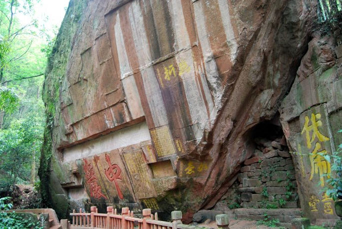 在“古中岩”石笋峰上,有一局富有历史意义的摩岩题刻:“大明正德改元,贼臣刘瑾乱政,予以执金吾官,退位还乡。瑾伏诛。辛未(1511),予奉召还朝,摩崖大书,时同游者,同年太守从恩,同贡士杨旦,同志沈崇、僧通开、圆禧侍砚。青神余寘(zhì )书。牧伯毒时芳刻石。”这局题刻的题写者余寘是余子俊之孙,是青神县明代正德年间人,被当时的宦官刘瑾专权迫害罢职回乡。刘瑾伏罪受诛后,余寘奉召还朝复职“执金吾”(大概是京都的卫戍司令长官),这局题刻是明代中期“皇权、宦权、阁权”尖锐冲突的历史缩影。