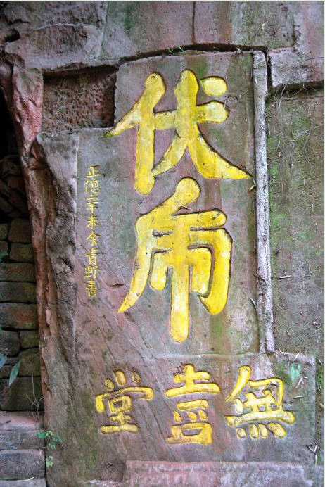 巨石左方角落处,雕塑着一只蜷卧而驯服的小石虎,壁间有余青野(明代太子太保兵部尚书、青神县人余子俊之子)题刻“伏虎”与“无尽堂”两局,字迹完整明晰。“正德辛未”是1511年。