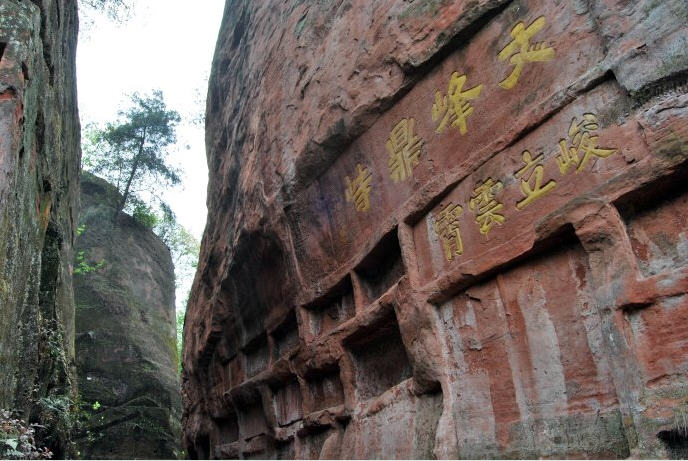 古来,峰壁上嵌刻诗碑颇多,或题峻立云霄,或题玉柱插汉,均为宋明名笔。这“文峰鼎峙”四字是清朝眉山知州金一凤题写的。