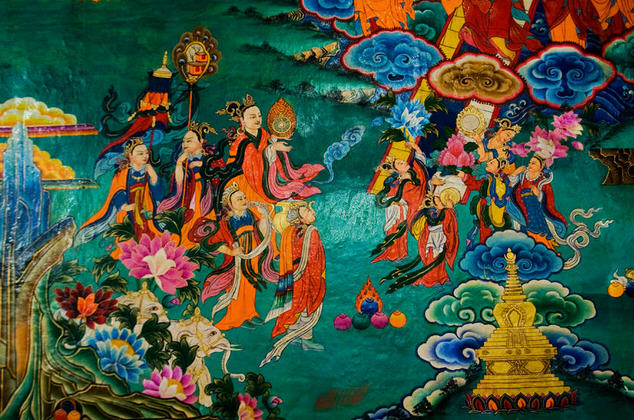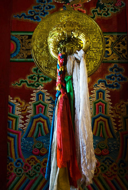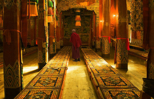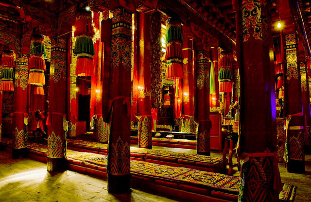 不断有人从公路上赶来。也不断有人从那些隐蔽的村庄出来,绕过黄黄的青稞地、嫣紫的豌豆地,走向伸向寺院的小土路。还有一些人,多半是高山上的牧民,穿得大红大紫的异常绚丽。看着他们从高山上慢慢挪下来,三两一伙、五六一群的,像是天上的神仙下凡来赶人间的集市。总是能见到那些剽悍的康巴男人,纵马扬鞭,一路嘹亮地吆喝着,从远处驰骋而来,马蹄撅起一路烟尘。