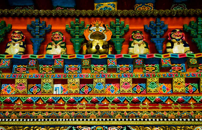白格寺开光仪式的正式开始,是在一个大喇嘛对着麦克风严肃地讲话后。那个时候,寺院的伙房里,几大笼子牦牛肉包子正出锅,腾腾地冒着热气。而树荫下,被装扮得容光焕发的赛马,也在悠然地闭目养神。那真是一些五彩的缨络、年代久远了的马鞍。