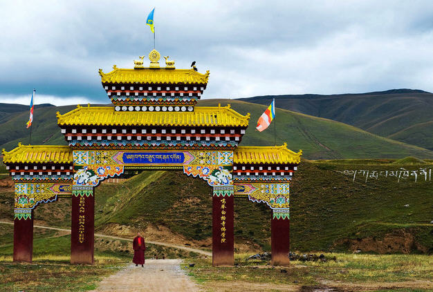 白格寺坐落在一座大山前的平坝子上,坝子下面是算不上开阔的河谷。那些四通八达的公路,就在这河谷里蜿蜒穿过。白格寺在那坝子上,像一位遁世的隐者,不管你从哪个方向哪个角度遥视,都是那么一副淡泊的模样。