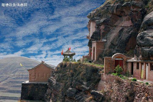 石窑寺在隆德县城西三里山坳处。山一脉直通陇山。窟大约凿于南北朝时,县志载创自宋绍兴年间。一面绝岩,中间凿三窟:一是大雄殿,一是无量殿,一是大士殿。左右两小窟,一文昌宫,一子孙宫,两小窟当为明朝后期所凿,该寺有佛道合一倾向。殿居中镌刻“磨日宕霄”四字。山岩呈红色,岩阶三十六级,从北登窟七十二级,共一百另八,现无存,仅遗痕而已。