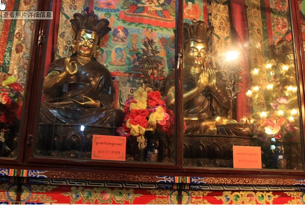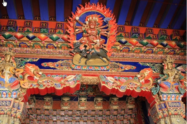 这时大经堂旁护法神庙里念起了经,我忙着赶去。经堂有一个很大的案台,台上酥油灯明亮闪烁。在苯教护法神塑像前,一位年轻的喇嘛正在为信徒念经祈祷。他在吹响海螺的同时,用一根弯细的鼓槌,敲响吊挂在空中的皮鼓。那鼓声由轻到重,节奏有力,震撼人心。当鼓声突然间戛然而止时,我几乎能听到自己的心跳。我急忙献上一些钱,祈求保佑。那喇嘛念了一串祝福的咒语,还给我一根打着结的蓝色布带。蓝色是苯教的基本色调,朗依寺的如意佛塔内供奉的一千多尊铜像全是以蓝色作为底垫的。蓝色象征着海洋,博大无边。
