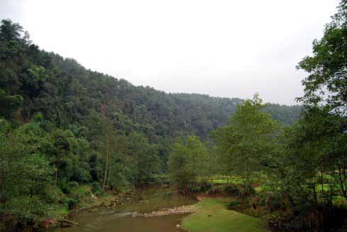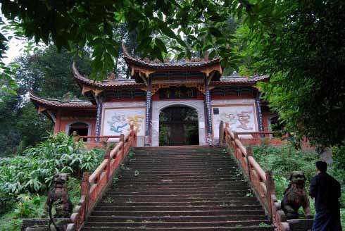 河边,是青翠的竹林,沿着河边的石板小径前行一段,就到了九龙山山门。山门前,湖水一湾,古名“大月滩”,实际上是在金牛河上围堰而成的龙华水库(属夹江县)的一角。九龙山的东南端与夹江、洪雅、东坡区接壤,金牛河流过这里,流经夹江,在青神县汉阳镇汇入岷江。