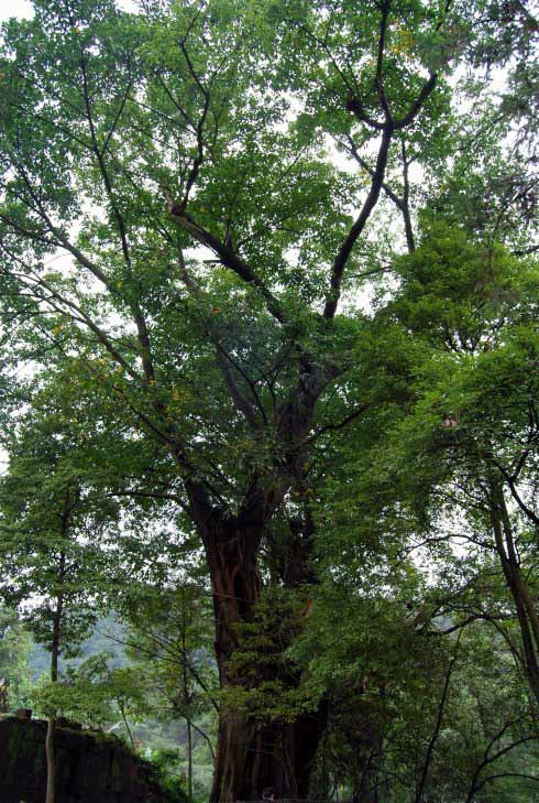 大雄宝殿,内供三身佛,殿前,挺拔着一棵高大繁茂的榕树,需三人才能合围。