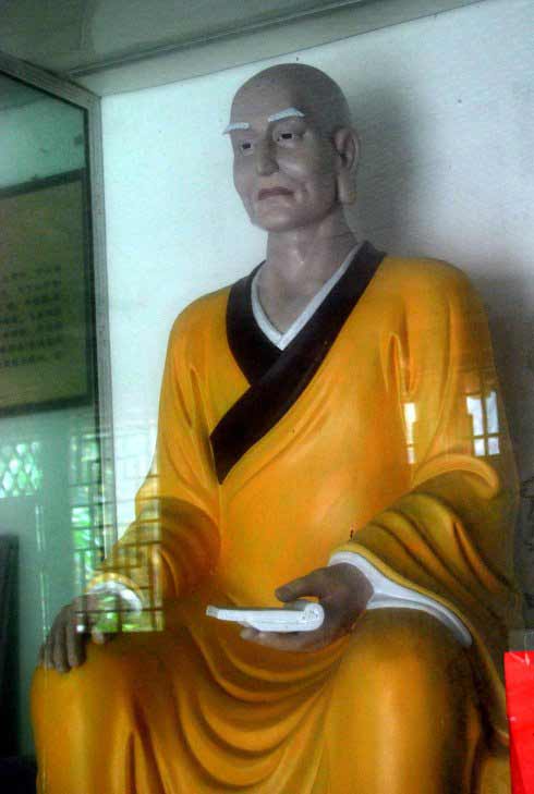 五代时丹棱城东人可朋弃官回乡披缁于竹林寺18载,与卢延让、欧阳炯、方干、齐己、贯休结为诗友。可朋一生写诗千余篇,汇编成《玉垒集》,名篇《耕田鼓》震惊当朝。广政9年(公元956年),后蜀皇帝孟昶赐钱十万、布五十匹奖励时任竹林寺住持的可朋。明代文学家杨慎《升庵诗话》云:“唐世诗人,射洪陈子昂、彰明李太白、丹棱僧可朋不相上下。”明万历年间,僧一直大师建藏经楼,藏经书万卷。清道光29年(1849),丹棱知县毛震寿拨巨款修缮竹林寺,题“竹林烟月”于寺后崖壁上,并赋诗一首:“寒烟逼出一林秋,露下天高月满楼。古树深簧山寂历(寂静),道心诗梦两悠悠。”竹林寺在历代被列为“丹棱八景”之一。关于可朋,参阅博文《眉山历史人物图注(15)——可朋》,下图是竹林寺大雄宝殿左侧可朋祠内的可朋塑像。