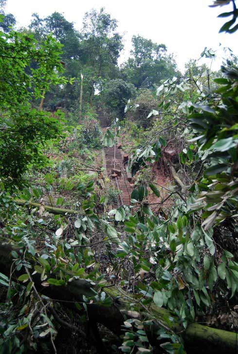 从观音殿右边可以上山,走不多远,是一道陡峭的“通云坡”。大概不久前这里出现滑坡,“通云坡”下方已被倒塌的大树阻挡,原来的护栏铁链也横陈在坡道中央,但仍然可以小心地穿过阻挡上坡。