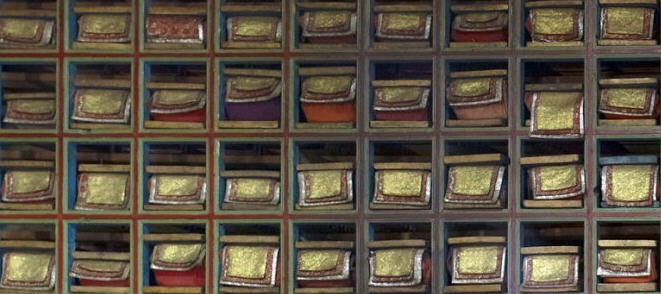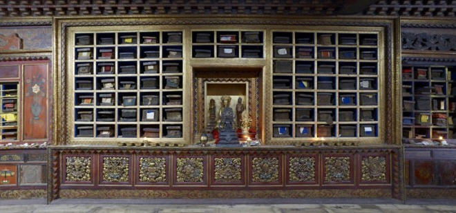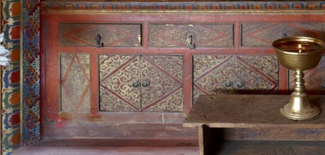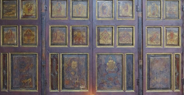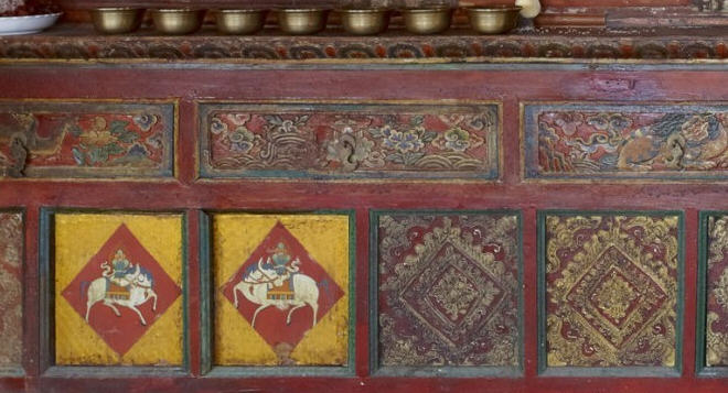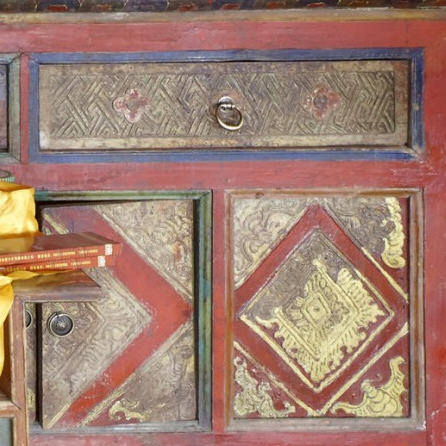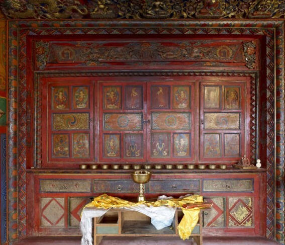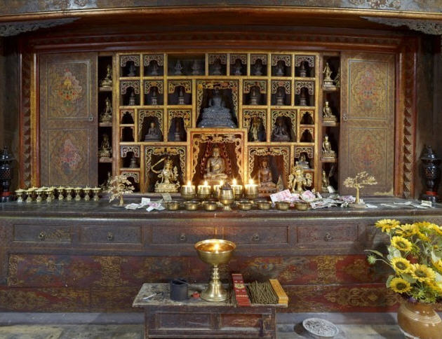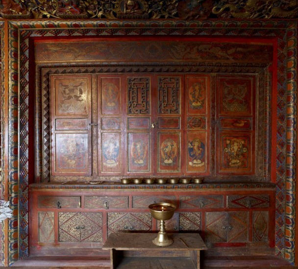 昌列寺,老庙二楼,保存着一批藏式老佛龛,都是嘎玛仁波切在昌列寺重建的过程中搜集、复原、保存下来的珍品,最悠久地有四百多年。揉和了不同年代,不同造型,不同纹饰彩绘等手法的佛龛装饰技艺,展现了数百年的历史衍化脉络,那是昌列寺经历时光劫难后仅存的法宝,凝结了上师对继承弘扬嘉绒藏传佛教文化精粹的殷殷之情,弥足珍贵。昌列寺的老佛龛已被列为四川省重点文物保护项目。