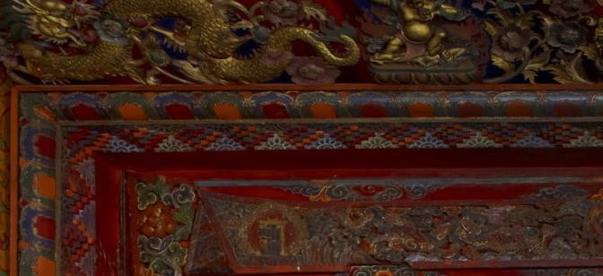 佛龛的顶部帽冠,一般以双龙朝拱摩尼宝珠为主题,含拱护佛法之意。龙有雕刻彩绘或以沥粉描金彩绘等手法装饰。佛龛可独立也可连续墙式布局。