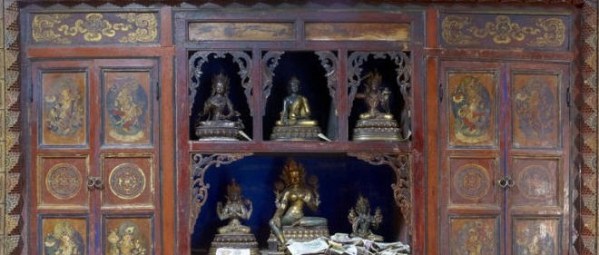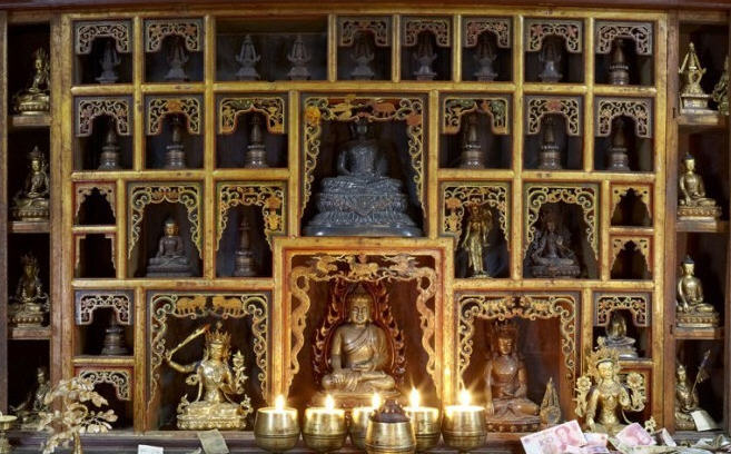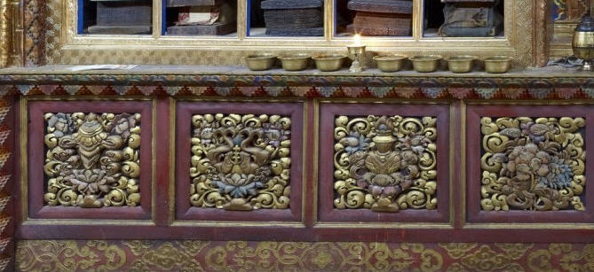 佛龛,是为供奉佛像而设立的龛形阁子。多以龙装饰,有单层、多层,也可连续水平延伸成一面墙。多以木质构架为主。以莲花、祥龙、八吉祥等佛教图案,镂雕浮雕装饰,或用螺钿,彩石,牙骨等镶嵌。