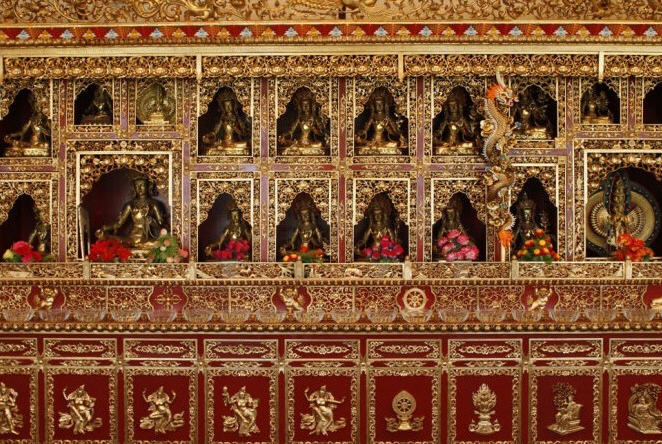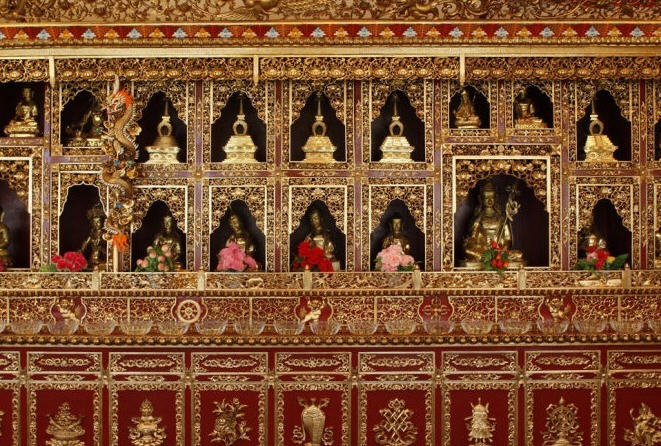 新的佛殿建起后,嘎玛仁波切用藏汉两地工匠的智慧巧工,重新规划,设计督造的。工艺精湛,典雅富丽,代表了现今工艺的最高水准。成为昌列寺藏传佛教佛龛艺术的新特色。