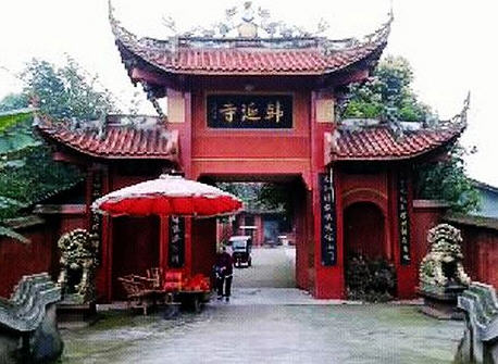 韩延寺原名兴法庵,地处四川省大邑县城南25公里之遥的韩场镇,在大新公路道左。韩延寺历史悠久,相传其寺建于明代。距寺一余里处,有个叫姚向超的人时任成都府府官,是他将兴法庵更名为韩延寺,并新建殿堂大塑佛像,美化寺院。姚向超本是平民百姓,尽上仕途前,曾到寺内祈福,果然如愿。大凡一般庙堂新塑韦驮菩萨像皆挺胸而立,唯独韩延寺的韦驮菩萨像曲腿而坐,迥异于常,这便是姚向超的杰作。后来,韩延寺遭到摧毁,重建于清朝康熙七年。