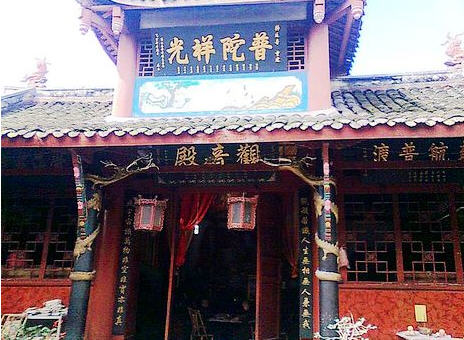 再往前为观音殿,乃是单檐式砖木结构,面阔三间,通宽约四丈,供观音塑像,匾书“慈航普渡”,于己亥年重建。