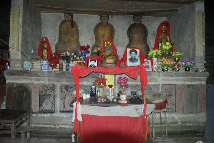 大殿内有雕龙刻凤,菩萨、佛像及各种响器。神龛修在中间后上方,石制,高2米,正面一米高处呈梯形,共分四台。用作供奉张家各世代祖宗牌位,让子孙敬仰。原供有川祖、土祖,后被损坏,现重新修复,还有十二园足置于左、右两侧,左侧前还有地母十三位。神龛后面两侧还各有两个高大的木制菩萨,大门前两边柱子上,左挂有金童,右挂有玉女,面向神龛神位。一进大门,便可见到神龛两侧从天而降的蛟龙所吸引,令人惊叹。
