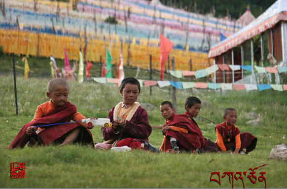 到了扎西持林,一颗悬荡的心,落定下来。我走进满是经幡飘扬的极乐法会会场,找了一块空地,像大家一样坐了下来,和大家一样念阿弥陀佛心咒。看到满目的藏族人,我又一次感到惊讶!很多人是全家来参加极乐法会的,我边上就有一位年轻的夫妇,两个孩子。小的孩子刚出生不久,还裹在襁褓里。美丽的少妇穿着节日的盛装,脸上露出安详的笑容,让人感到他们的幸福。这是我们汉地所没有的。在汉地人类许多淳朴无暇的品质渐渐地被那种人为的潮流时尚所代替。美发、美甲、美容、美胸、美腰、美腿、美裤,不知道有多少人造美,可怜这些人造的美能挡得住生死吗?当业报现前时后悔晚矣,中国有句话叫不知死活,真令人心痛。