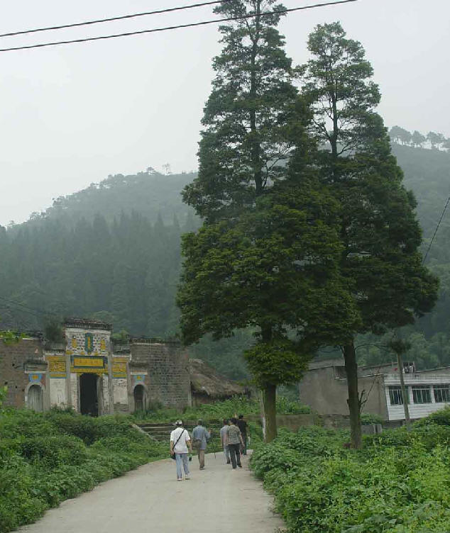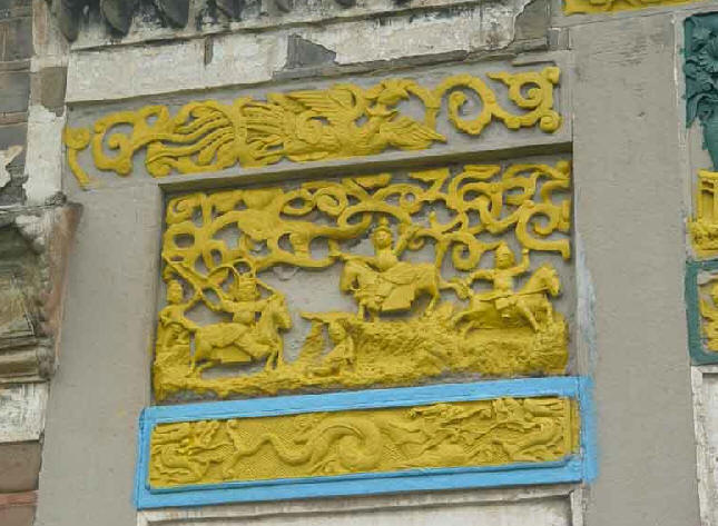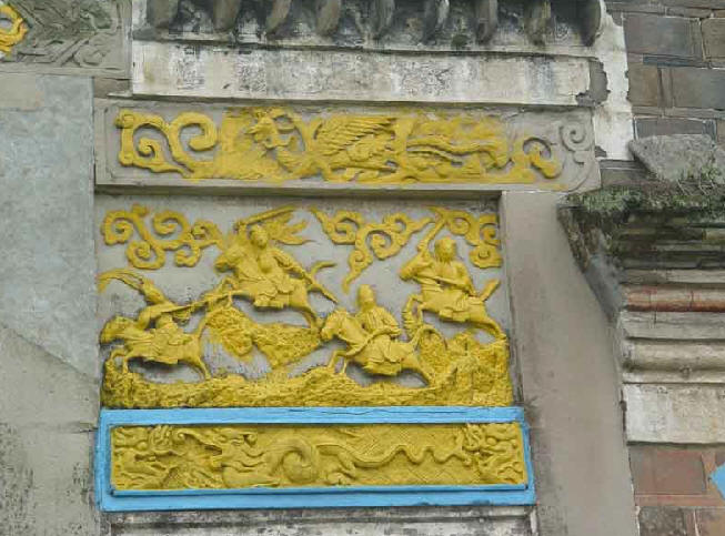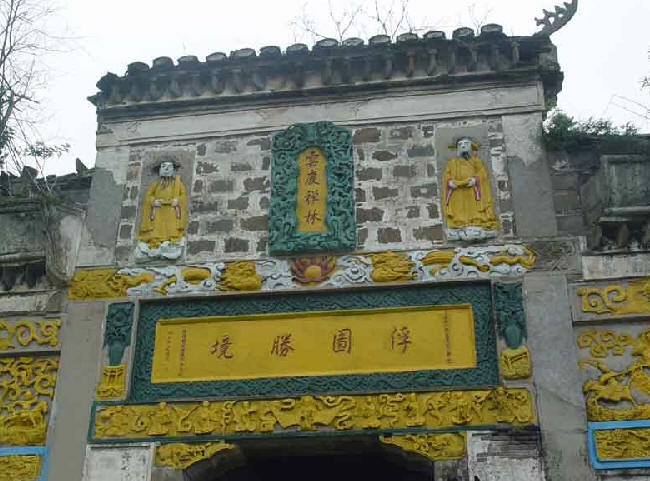 云庆寺开光大典惊动周边四十八庙堂,纷纷来贺来朝。拾级而上,山门巍峨,砖石重檐,门额顶上有“云庆禅林”“俘图胜境”八个大字,门联以山景水景地貌而题有一联:“渺霭禅林远带沱江满历眼;巍峨殿宇遥分豸角开天地。”左右山门额上题有“松风”“水月”,门上有浮雕画两幅,为三国典故人物图像。