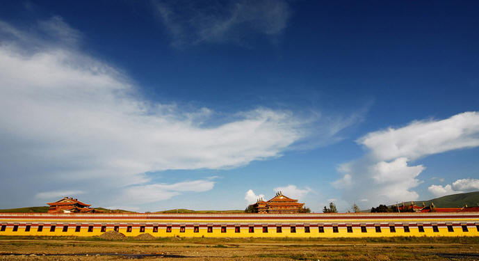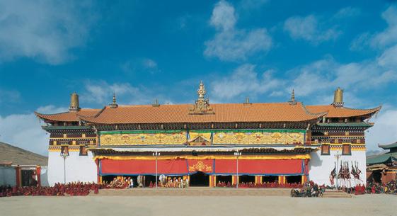 2、大经堂中最大的一尊佛像是用药泥塑雕成的强巴佛(弥勒佛)像,有四层楼约20米高,佛身内珍藏了千余部大藏经经卷。在大经堂中还珍藏有万余部《甘珠多》、《丹珠多》等著名藏文经典,珍藏有数十座宗教灵塔、宝塔。大经堂墙上挂满了堆绣、彩绘和用矿物颜料绘制的许多珍贵的唐卡。
