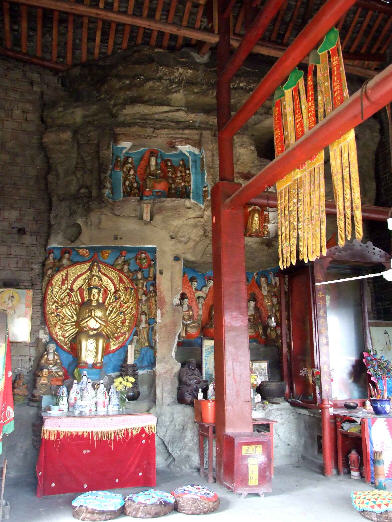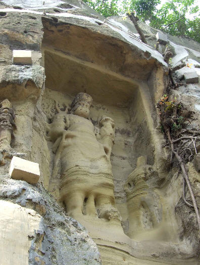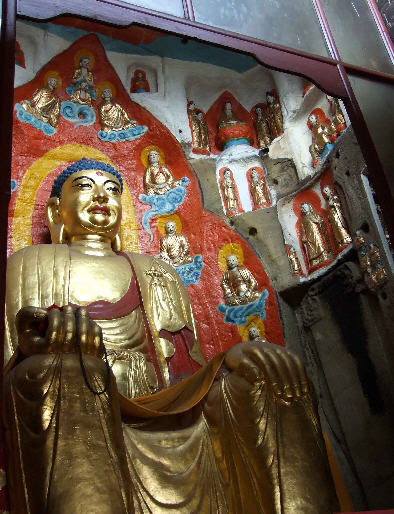 佛像为唐代开凿的弥勒坐佛,佛高5.8米,宽2.6米。左右龛壁上,刻有28小龛120尊造佛。