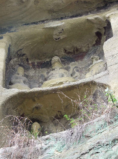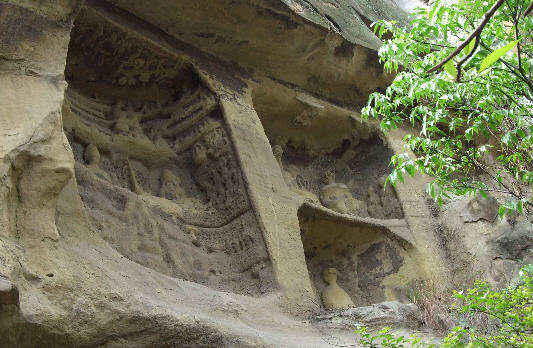 荣县二佛寺沿崖林立,造像上千尊,唐宋时名“浮图崖”,亦称千佛崖。因其众多佛像装金饰彩,阳光照射,金碧辉煌,故又称“金碧崖”。