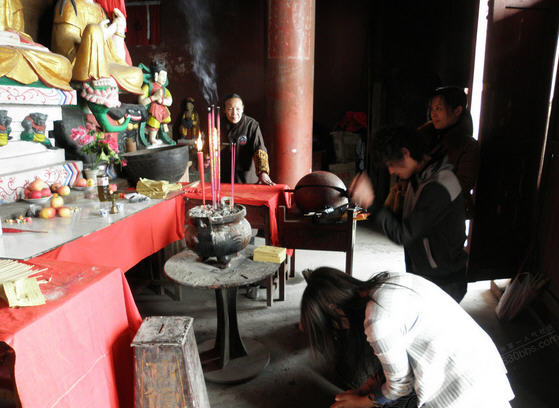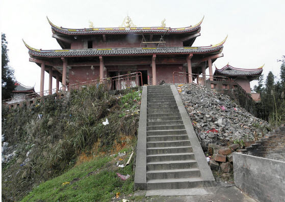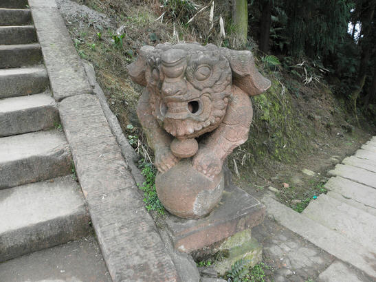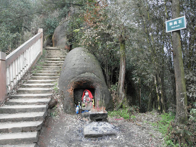 从和尚石、牛王石、猪鼻拱石上山,一条丹岩石板路依岩直上普照山寺。过了南天一门,就进山上庙了。一尊弥勒佛座像,笑迎四方信男善女,缓步登梯108步,大有直上南天门之感,一对石狮相对而戏,流泉声声犹如丝弦梵音,每登高一步,就离天近了一尺。于是笔者一口气登上山顶,立于大雄宝殿大门前,举目四望,赤水东逝,九支春晓,古纯烟柳,打鼓夜明,云开林麓送来金凤之青,日出扶枭光耀乌蒙余脉之碧,难怪庠生卢其武有竹枝词云:“高峰打鼓应枇杷,圣灯照着磕石丫,弯刀砍过雷公背,媳妇伸手摘金花。”把普照山四周地名、山名、岩名全说到了。