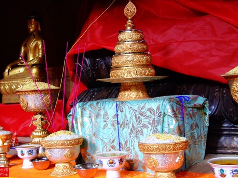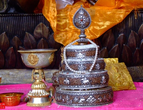 后来,对热乐满顶寺恩德最大的是仁真顿珠,他在嘎脱寺获得了堪布学位。新建了大经堂,还在多处修建了道场和三宝所作等。最终成就虹身而显现圆寂,空中降下许多兰花,据说他是药师佛之化身。