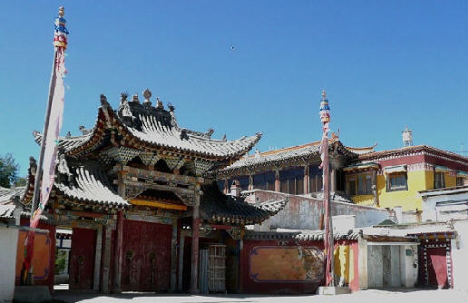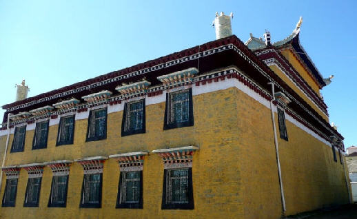 寺院建筑风格别具一格,既有藏族传统的建筑风格,又有汉武建筑风格,两者合二为一,规模宠大壮观。主要建筑有三大扎仓的经堂、达扎活佛的寝宫、寺院藏医门诊部、宗喀巴殿、怙主殿、犀甲护法神殿、时轮塔、菩提塔、尊胜塔、降魔塔,还有僧众住的禅院、转经房等。寺内除珍藏有众多佛及菩萨像外,还有金汁抄写的《般若经》等珍贵经典,以及供有三千多年历史的佛祖像,高僧(藏文字母)字骨和印有六世活佛手纹的石碑等许多珍贵文物。
