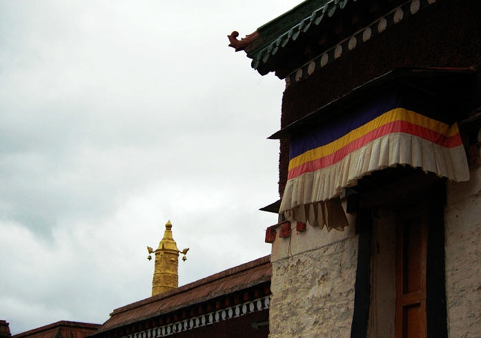第五层是宝塔的塔门位置,塔门外四周围着护拦,人可以站在护拦以内的地方鸟瞰寺庙的全景。走进重叠流金的大方门,里面是一个面积不到5平方米的小佛殿,佛殿内供奉着宗喀巴师徒三尊像;