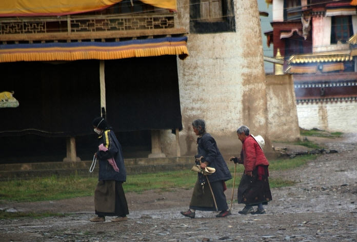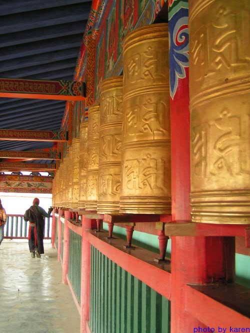 转经走廊是教民虔诚向佛、一心行善、祈祷平安的转经筒长廊,转经筒用黄铜皮包裹,里面装有活佛加持过的经书,外表刻着“嗡嘛呢叭咪吽”即六字真言,意为全知全能的观音菩萨保佑。转经筒按顺时针方向转动,教民转经不仅可以积功德,还具有锻炼身体之效,对于不会念经者转经筒每转动一圈就代表颂经一次。在这里每天都有成百上千个教民前来转经,尤其是早晨和傍晚这里往往人流如织,因为转经可以达到他们还愿的心愿。