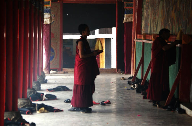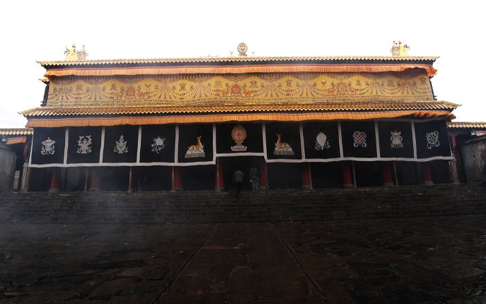 大经堂第三层是可容纳二百余名僧众的尊者殿,殿内供有整座寺院的主镇圣缘佛像以及重达两公斤多的菩提萨多法王八思巴的舍利牙。尊者殿的右侧建有吉祥耀焰的华丽寝宫。