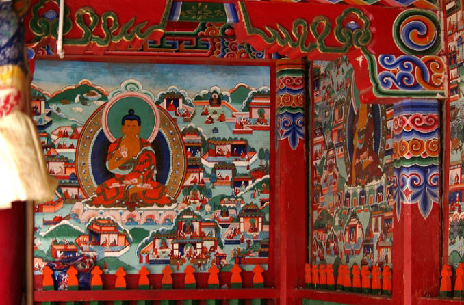 庭院内二十四根柱子为相间的墙壁上,绘有释迦牟利佛本生故事,绘画精湛、美妙绝伦。