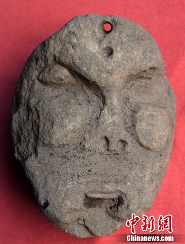 据介绍,出土的石雕头像高15.1公分,宽10.公分,厚5.2公分,面相椭圆,额头突出,立眉,三角眼,直鼻,大鼻孔,张口露齿,上唇有短,双耳已残。石雕头像两颊上,各有一个圆形雕饰,额头正中有一个小圆孔,类似佛教的吉祥痣。