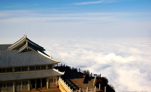 从殿里出来,到了著名的小睹光台,看着眼前的云海,简直是美不胜收。石壁下不断涌来白花花的云浪,它们前呼后拥,你追我赶,争先恐后,一浪高过一浪,一浪猛过一浪,既有水平方向的涡漩,也有垂直方向的翻腾,呈现出“乱石穿空,卷起千堆雪”之势。远处山峰犹如座座孤岛,只现出青葱的峰巅。不知是谁在吟诵着 “峨眉高,高插天,百二十里烟云连”的诗句,突然就有了飘飘欲仙的感觉。等到清晨的时候,来到小睹光台观赏峨眉山的日出,清晨的薄雾总会涤荡了我们的心灵,使人心旷神怡。当红日从东方升起,把云海都染成金色,大自然的伟大都展现在人们的面前。